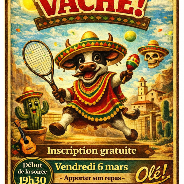 Hola ! Préparez-vous… la Soirée Vache débarque au club version 100% mexicaine Au menu : tennis, bonne humeur et ambiance caliente La règle de la Vache (1 vs 1) Tu gagnes tu RESTES sur le terrain Tu perds tu laisses ta place au suivant 3 points d’affilée = 1 VACHE ! (et ça peut […]